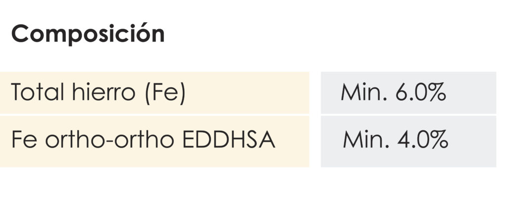 IRON CHELATE 6% EDDSHA in the form of microgranules totally soluble in water. Prevents and corrects iron chlorosis in all crops.