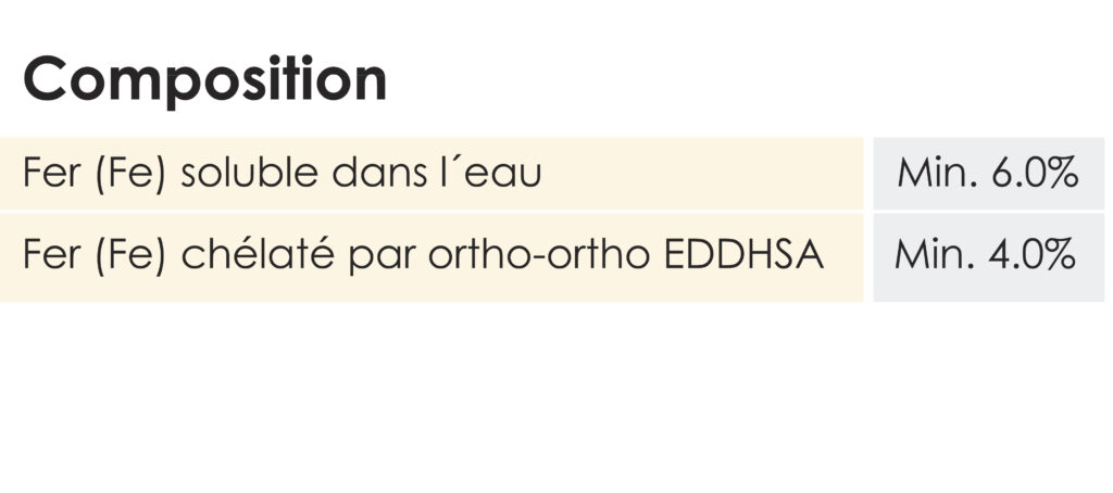 Kelgrow premier 6% EDDHSA contient 6% de fer chélaté par l’acide EDDHSA, principalement sous la forme de l’isomère “Ortho-Ortho”.