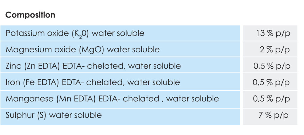 It helps the fruit development process, improving colouring, ripening, flavouring and consistency. It is a fertilizer with a high potassium content, enriched with iron, manganese and zinc chelated by EDTA.